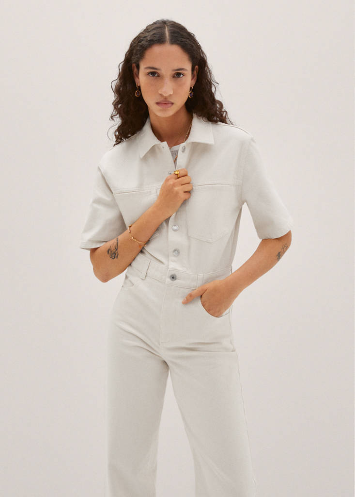 Tejido de algodón estilo tejano vaquero. Diseño largo. Diseño recto. Cuello camisero. Manga corta. Trabillas. Dos bolsillos de parche en la parte delantera. Dos bolsillos de parche en la parte posterior. Dos bolsillos laterales. Cierre de botones en la parte delantera