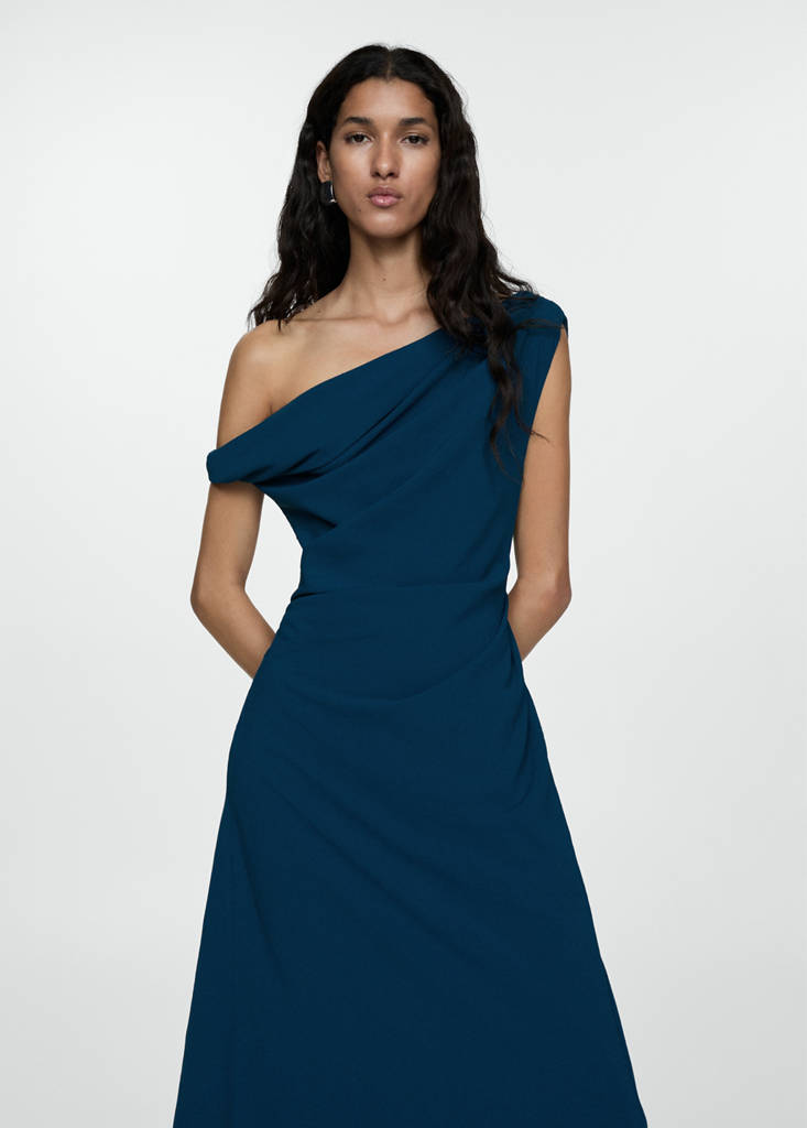 Tejido fluido. Diseño recto. Diseño largo. Diseño asimétrico. Escote asimétrico. Sin mangas. Cierre cremallera invisible en el lateral. Bajo asimétrico. Detalles fruncidos. Colección fiesta, ceremonia y comunión. El color azul es exclusivo online. Diseño entallado
