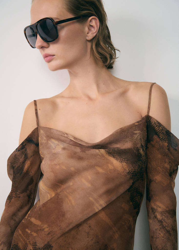 Manga larga. Colección fiesta, ceremonia y comunión. Tejido ligero. Tirantes finos. Estampado. Diseño recto. Cuello escotado. Bajo asimétrico