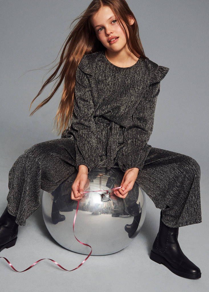 Tejido de lúrex. Diseño recto. Cuello redondo. Manga larga. Detalle de volantes. Cierre de botón. Colección fiesta y ceremonia. Total look